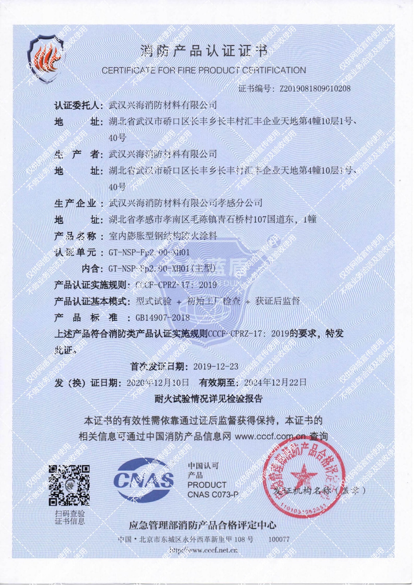 室內非膨脹型2小時鋼結構防火涂料消防產品認證證書