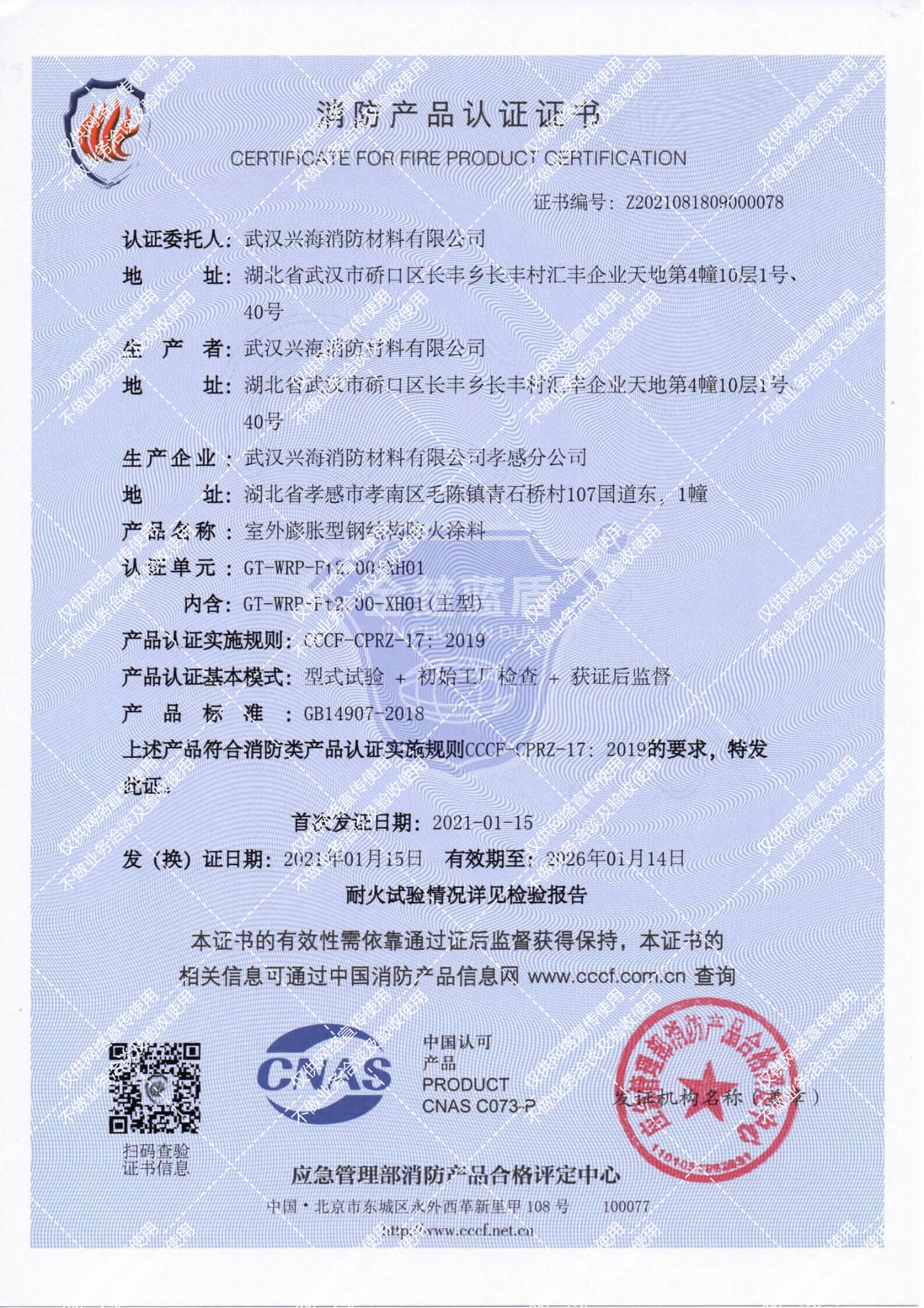 室外膨脹型(特種)鋼結構防火涂料消防產品認證證書